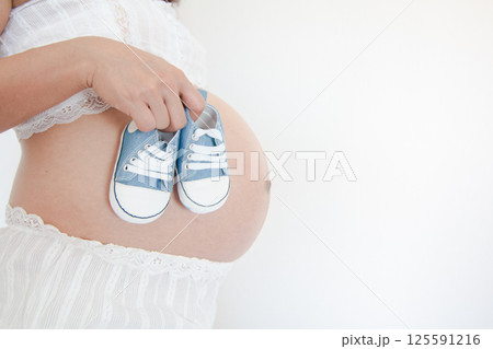 Mother-to-Be Holding Baby Shoes with Anticipation Against Bare Belly
