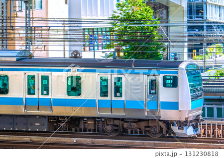 日本の横浜都市景観 横浜駅に入る京浜東北線の電車などを望む