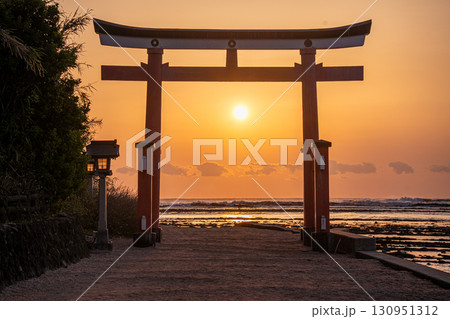 神域に昇る太陽 — 青島神社の大鳥居と鬼の洗濯岩