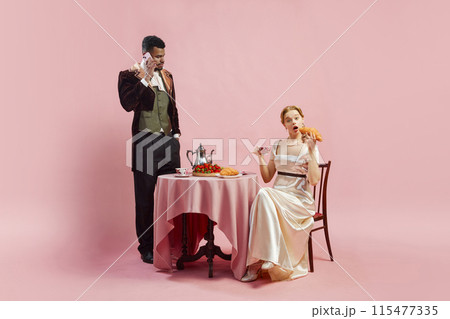 Royal famine morning. Man talking on mobile phone, woman eating croissant against pink studio background. Period costumes