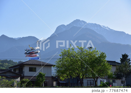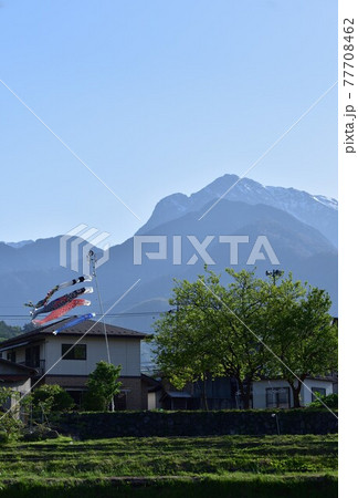 北杜市白州町、甲斐駒をバックに五月の風を泳ぐこいのぼり(横位置)
