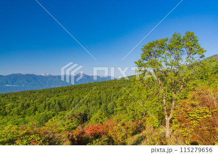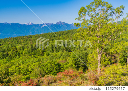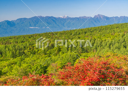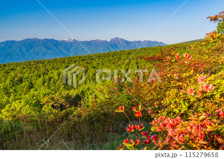 (山梨県)レンゲツツジ咲く清里の美し森から望む、南アルプスの峰々