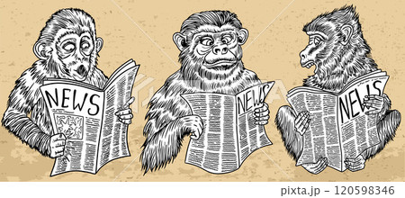 Design set with vector illustrations of cartoon funny monkeys surprised to read the news against textured background. Clip art of animals reading a newspaper. Hand drawn engraved comic artworks