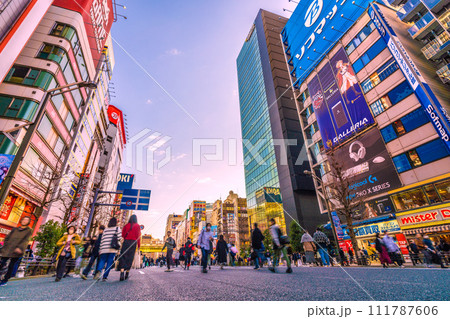 日本の東京都市景観 外国人観光客らで賑わう秋葉原駅前(中央通りではホコ天実施)…=2月18日