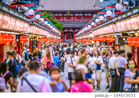 日本の東京都市景観 7月。賑わう浅草寺。はほぼマスク無しの方になったが、巨大感染爆発はない=1日