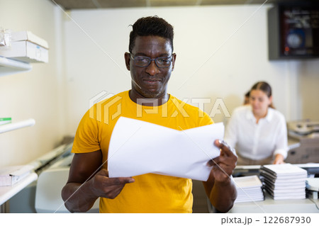 Focused African American man checking the print quality and accepting color proofs in the printer house