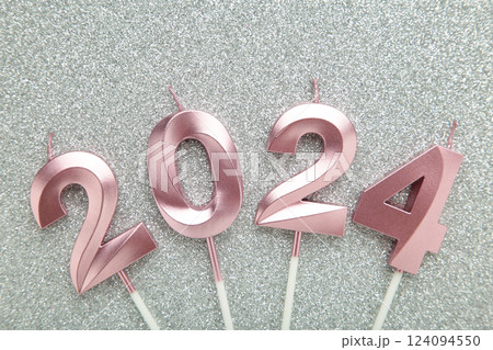 Happy new year 2024 on silver glitter background. New year holidays card with candle