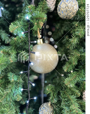Holiday spirit background. Christmas tree decorations, glowing garland.