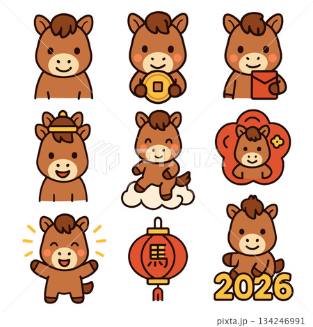 Cute brown horse character holding coin and lantern, festive joyful New Year celebration