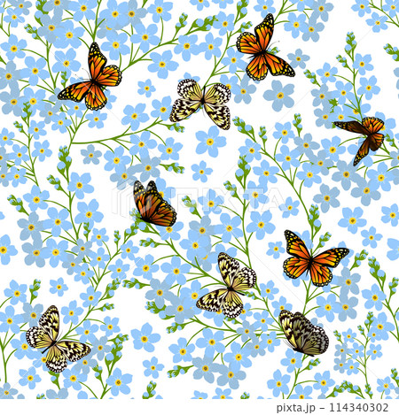 Seamless pattern of blue forget-me-nots with butterflies. Hand drawing. Not AI. Vector illustration