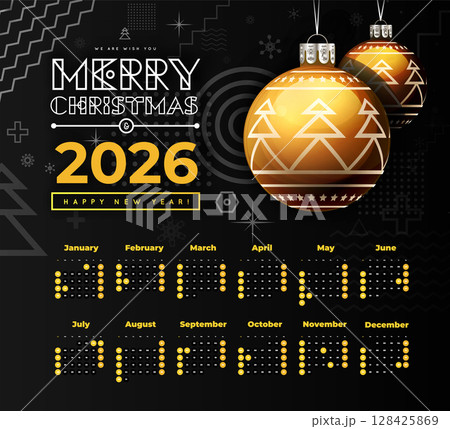 Congratulations on the New Year 2026 on the back ground of Christmas tree balls. Vector illustration with calendar