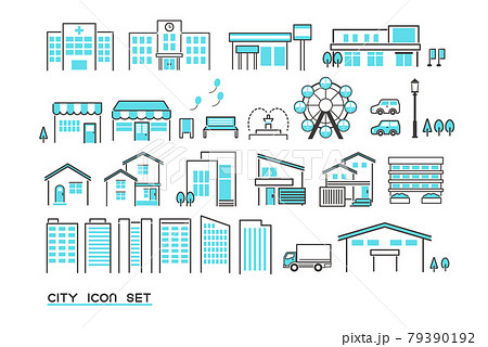 シンプルでかわいい街並みのアイコンセット/ベクターイラスト素材/まとめ/病院/学校
