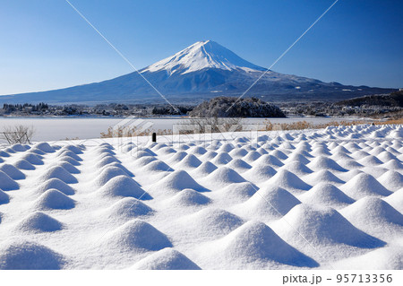 冬 雪のラベンダー畑と富士山の風景 河口湖大石公園