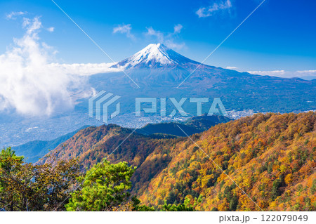 (山梨県)桜紅葉した新倉山浅間公園、忠霊塔と新雪富士