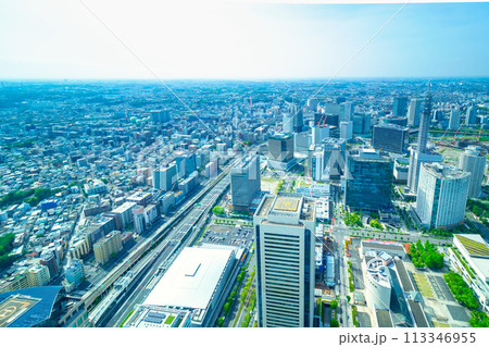 日本の横浜都市景観 みなとみらい線 新高島駅前のビジネス街などを望む=23日