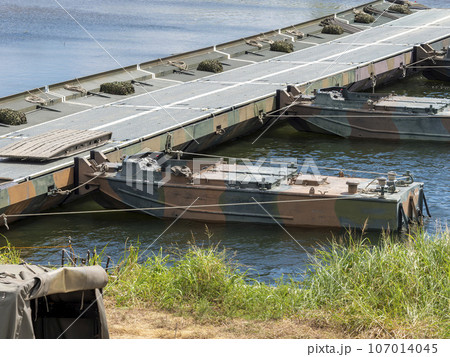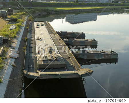渡河訓練で架橋作業中の陸上自衛隊