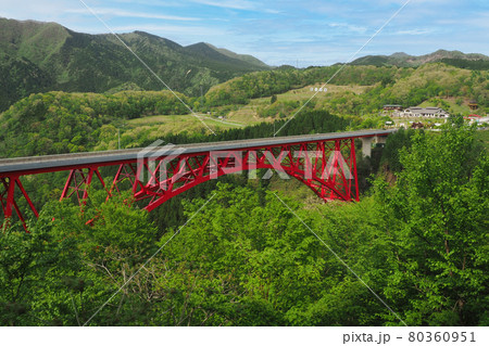 山間の赤いアーチ橋|奥出雲おろちループ・三井野大橋