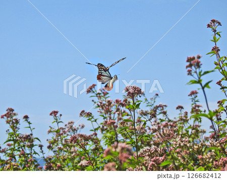フジバカマの花のそばを飛ぶ旅するチョウのアサギマダラ