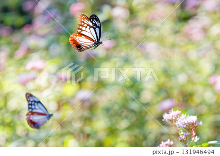 フジバカマの上を舞飛ぶ渡りの蝶アサギマダラ