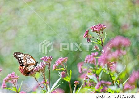 ピンクのフジバカマにとまる渡りの蝶アサギマダラ