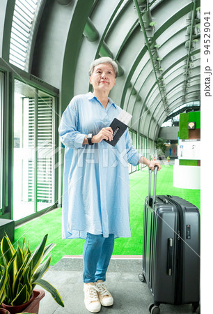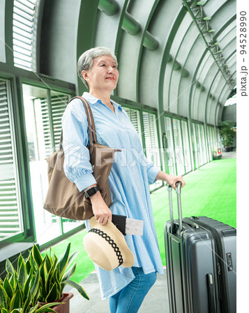 60多歲的亞洲熟年婦女微笑著站著,身旁有手提箱行李袋和手持登機證與護照,適用於covid19疫情後旅