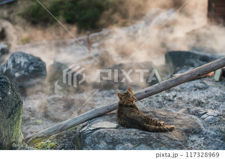 tabby cat in mount Unzen Hell valley with heavy gas, Nagasaki