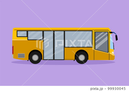 Graphic flat design drawing city buses seen from the side serving commuter passengers departing and returning from home to the office. Vehicle on roadway. Urban life. Cartoon style vector illustration