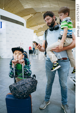 Father holding cute caucasian boy in airport. Child with suitcase and backpack waiting for delayed flight. Travelling with kids
