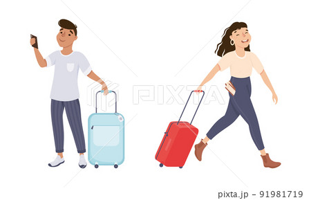 Man and Woman Tourist Character with Suitcase and Luggage at the Airport Vector Set