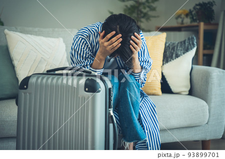 旅行の準備をするミドル女性(落ち込む・ショック・キャンセル)