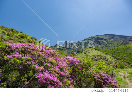 晴天の阿蘇仙酔峡に咲くミヤマ霧島