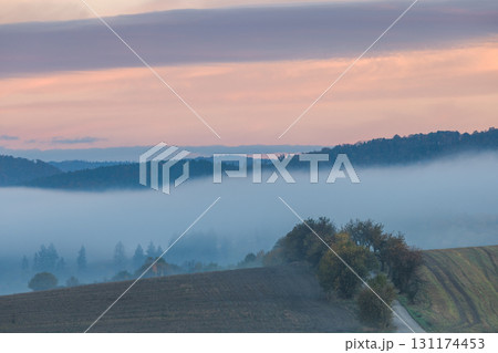 Misty Sunrise Landscape with Hills and Valley, a serene and atmospheric view of nature's beauty