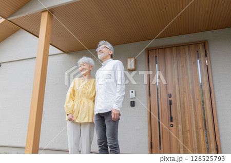 住宅の前で空を見上げる車椅子に乗ったシニア夫婦
