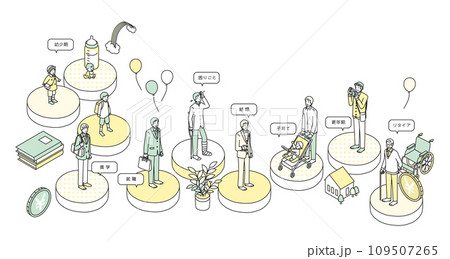 人生でお金がかかる12の項目アイコンと女性スタッフのセット