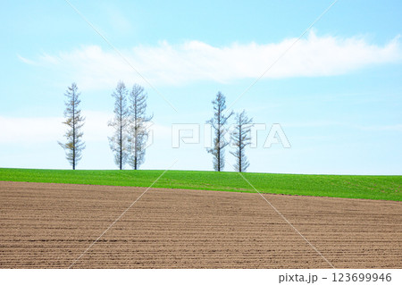 初夏の北海道美瑛町の観光スポットであるマイルドセブンの丘の風景