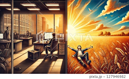 現実世界で働く男と自由を謳歌する男を表したイラスト