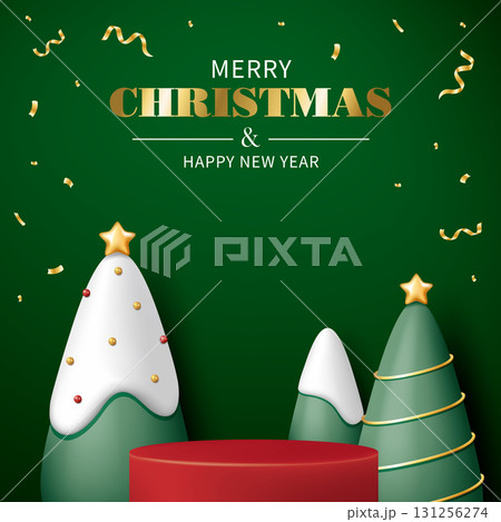 3D聖誕樹、裝飾品和圓形商品展示平台在紅色背景,聖誕節橫幅廣告海報宣傳單素材圖片