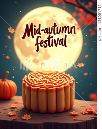 一顆月餅與滿月月亮秋天背景,中國傳統節日中秋節廣告海報宣傳單素材圖片