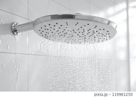 Stainless steel showerhead mounted on wall with water cascading in a steady stream in modern bathroom setting without anyone present