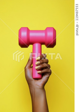 A person holds a bright pink dumbbell against a cheerful yellow background during a workout