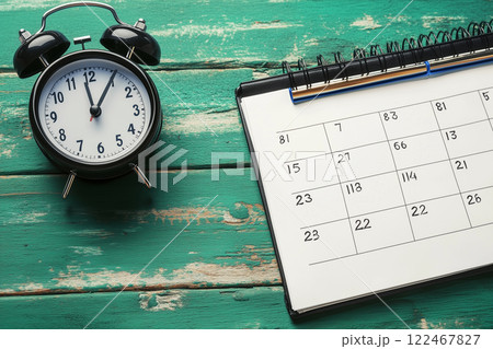 Vintage Alarm Clock and Desk Calendar on Rustic Green Wooden Background for Time Management Visuals
