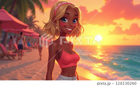 Cheerful beach scene at sunset.