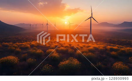Wind Turbines amidst flower fields at sunset, a vision of renewable energy