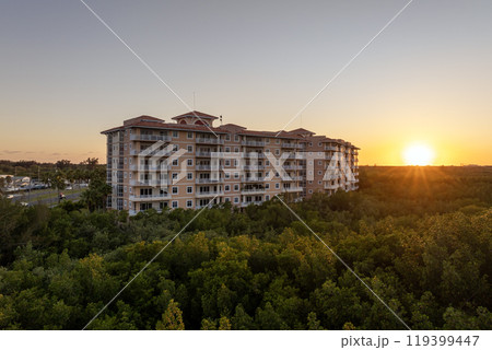 New apartment condo building in Florida suburban area. Family housing in quiet neighborhood. Real estate development in American suburbs