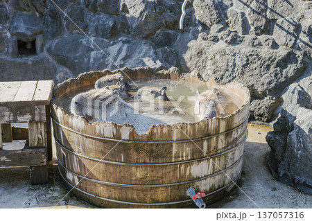 伊豆シャボテン動物公園 風呂桶に入るカピバラ 木桶風呂の入浴シーン