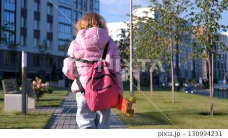 Rear view of teen girl walking toward school in the morning wearing a pink backpack and holding a vibrant skateboard enjoying a sunny day