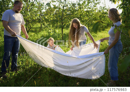 a family of four is playing with a white sheet in the garden, a toddler wants to flutter the sheet