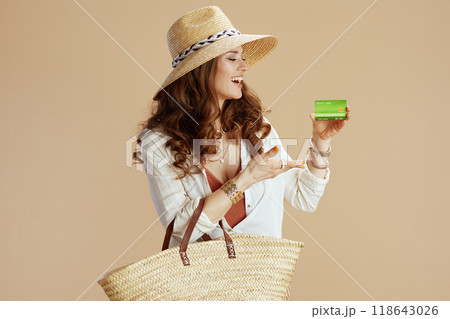 beautiful woman applies suntan lotion to her body. the sunny beach setting enhances her skincare routine, making sun protection a priority for her skincare. A girl uses moisturizer sunblock or