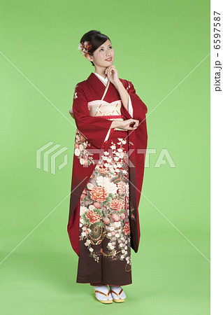 頬に指を当てる振袖姿の若い女性