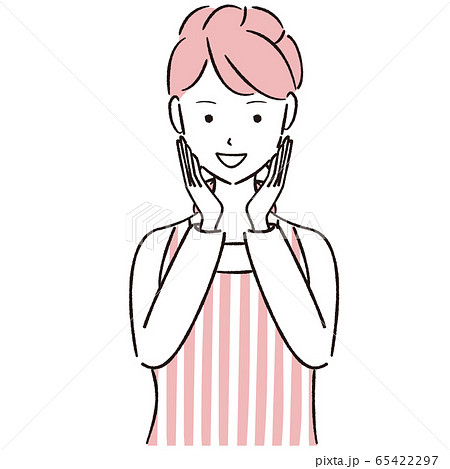 手描き1color 頬に手を当てて喜ぶエプロンを着た女性 ロングヘア